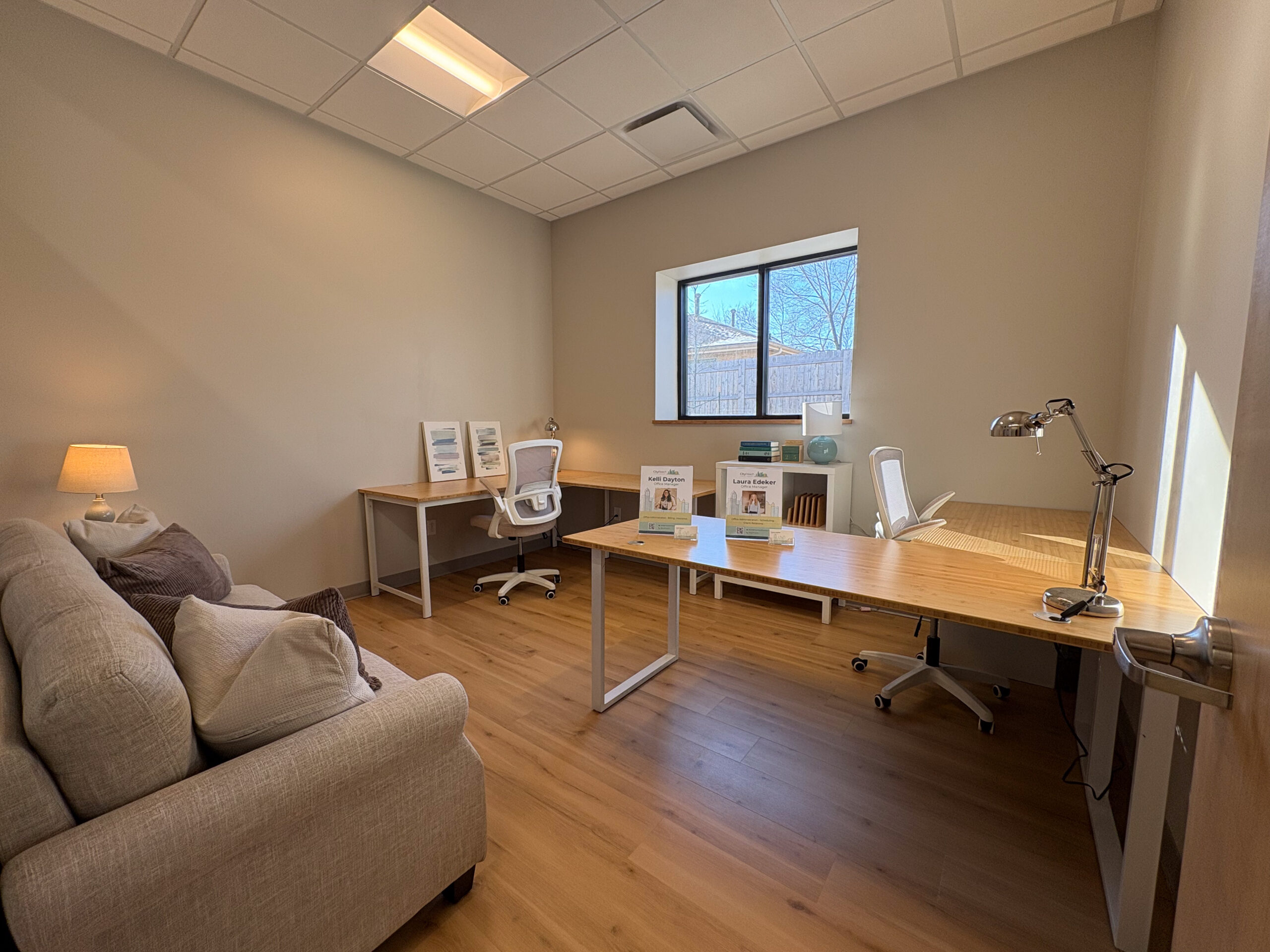The new space includes seven private counseling offices, a welcoming reception and lobby area, a kitchen, three new restrooms, storage and janitorial spaces, a staff training room, and both staff and mechanical mezzanines. Finishes were carefully selected to seamlessly match the existing occupied areas, creating a cohesive look and feel throughout the facility.