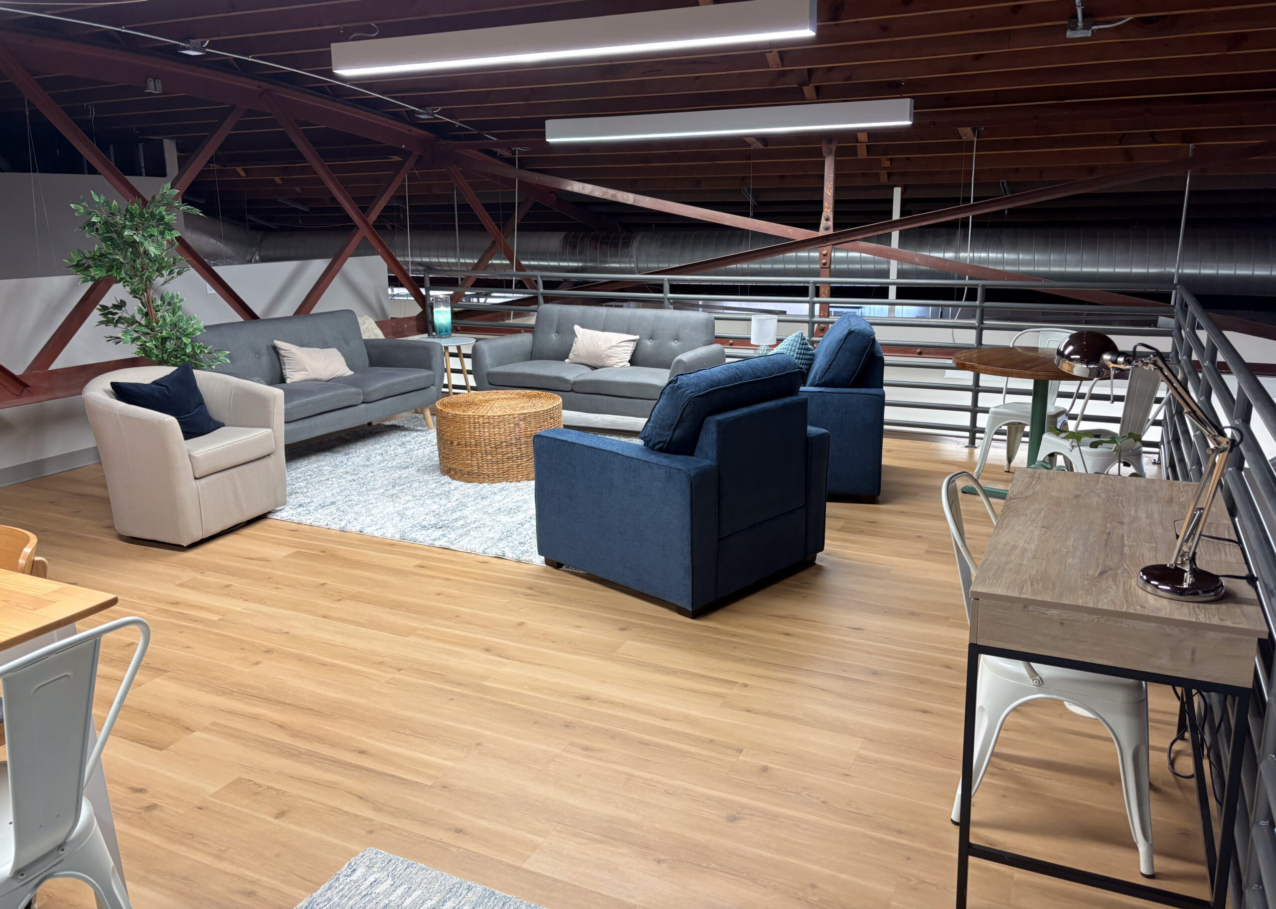 One of the project’s unique challenges was accommodating a staff mezzanine within the building’s bow truss roof system. The mezzanine location was carefully designed to maintain required clearance heights in compliance with the City of Des Moines building code. In addition, portions of the existing concrete slab were removed to install new underfloor plumbing for the restrooms, kitchen, and mezzanine footings.