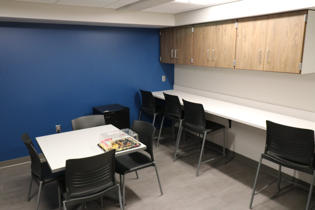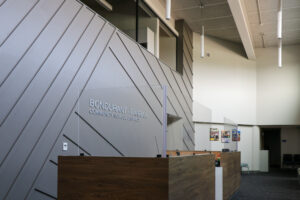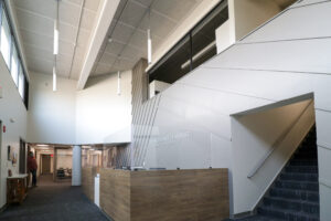 Construction activity involved transitioning some rooms to temporary spaces while permanently renovating others. One half of the existing wrestling room was repurposed into classroom space, while the other half was used as a temporary choir room, allowing the existing choir room to be renovated with an adjacent classroom space to create a new lunchroom and physical education space. The existing auditorium was repurposed to create a new band and choir room, allowing the temporary choir space to be converted to classroom space.