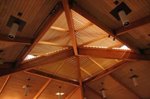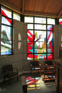 The renovation included work in the existing gathering space and the sanctuary, where a new sound system and acoustical work, choir platforms and a handicapped-accessible altar were installed located in the middle of the sanctuary to create a centrally-focused worship space. A wood sun shade was constructed above the altar area with baffles placed every 4-6 inches that can be adjusted to an appropriate angle to block the sun.